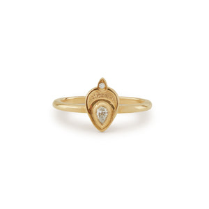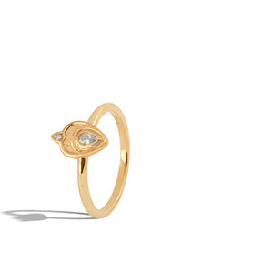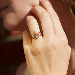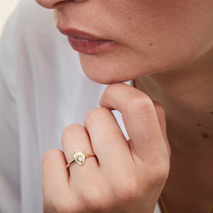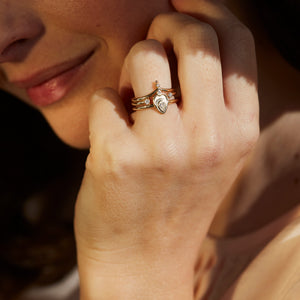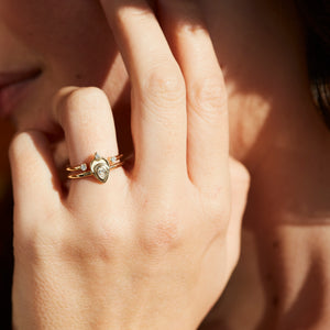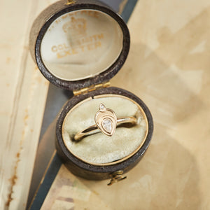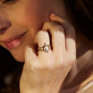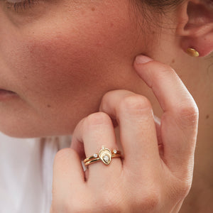 A completly unique, low profile, easy to wear and budget friendly engagement ring, this beauty is one of our favourites. A teardrop and round diamond accent this small statement ring that can we worn alone, or accented with a variety of wedding bands. Pictured in 14k yellow gold. Available in any karat and colour of gold, lab grown or natural diamonds. Please allow 4 - 6 weeks for manufacturing.