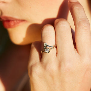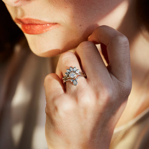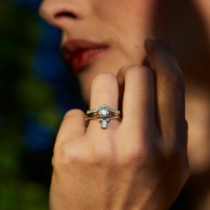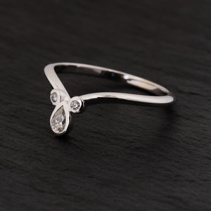 One of our favourite accent bands this year. This lovely pear with round natural diamond ring is designed to add a little extra attention to any ring combination. Accents most solitaire rings perfectly. Pictured in 14k white gold. Available in any karat or colour of gold. Please allow 4 - 6 weeks for custom manufacturing.